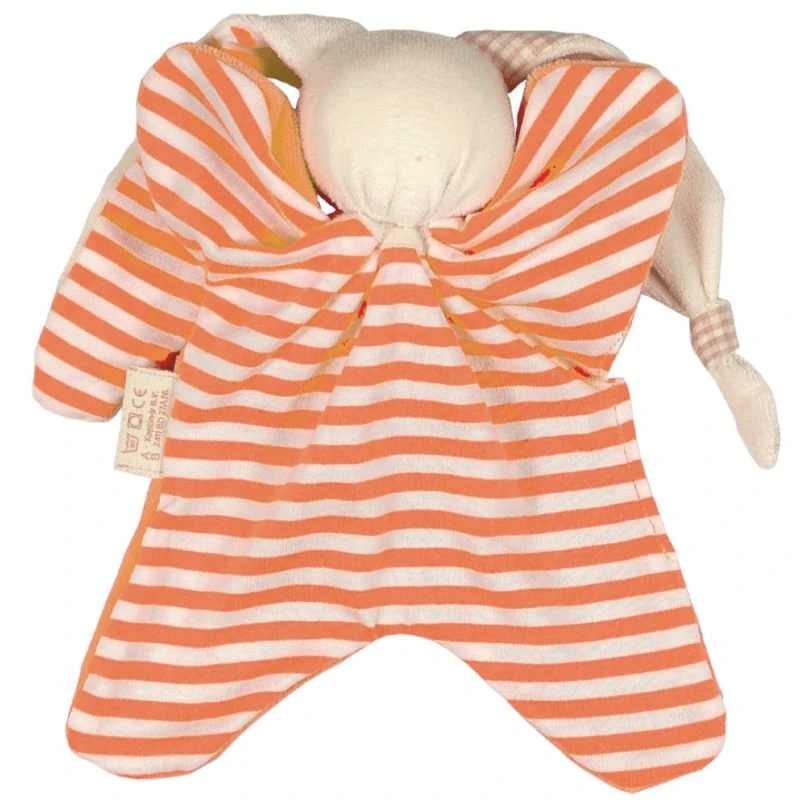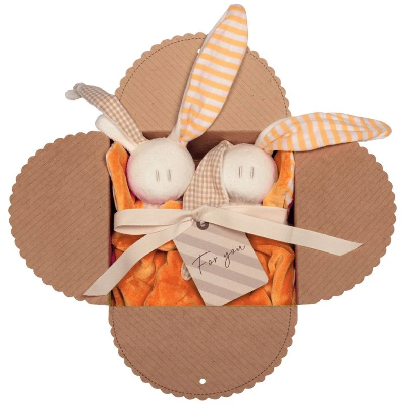 Pour les touts petits, Amour et réconfort auprès de ce Doudou en coton bio Coffrets 2 Doudous Hochet Coton Bio Keptin-jr Toddel Orange Mandarine 21 cm, 2 doudous dont la forme en ailes de papillon offre 4 prises parfaites en plus de ses 2 longues oreilles mi velours mi jersey vichy beige et écru, dont l’une est nouée… pour être mâchouillée. La face du doudou Toddel est unie en velours couleur orange mandarine, le dos dans un jersey rayé bicolore…Un doudou écologique dont la conception favorise le développement de la filière bio et le rembourrage celle du recyclage. Un petit doudou très doux, facile à saisir, pour se frotter et mâchouiller sans fin et accompagner bébé de partout, ensoleiller ses journées, adoucir ses nuits et consoler ses ‘petits bobos‘… ce doudou en coton bio Toddel sera de toutes les aventures. Le coffret comprend 2 doudous, un sac de rangement et un échantillon de lessive sans parfum…
