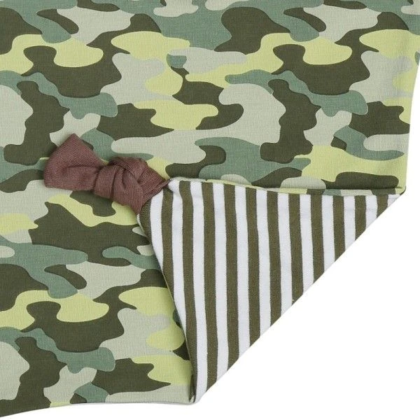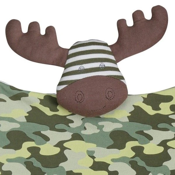 Pour les bébés bio, et dès la naissance, Eveil physique, Jeux & réconfort avec ce magnifique Doudou Carré Plat Hochet Apple Park™ Élan ‘Général Moose’ 30 cm en Coton Bio. Un doudou mouchoir, plat et carré, dont les pattes sont de petits nœuds à mâchouiller, le ventre côté face est fait d’un jersey couleurs camouflages rappelant la tunique de la peluche … et côté dos, d’un doux jersey de coton bio rayé Vert-kaki et blanc , et surplombé par la sympathique bouille bien veillante et quelque peu directive et protectrice de notre petit Élan ‘Général Moose’ souriant mais sérieux avec ses bois majestueux, … un doudou qui est là pour rassurer bébé. Avec ce Doudou plat Organic Farm Buddies™, Bébé pourra se dégourdir les doigts, mâchouiller, découvrir les couleurs, les formes, et les câlins. La tête du doudou contient comme les hochets un petit grelot discret.