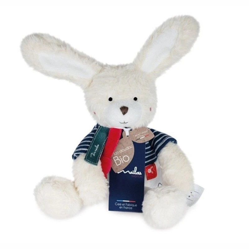 Pour les bébés bio dès la naissance, éveil émotionnel et câlins éclatants de tendresse et de bonne humeur avec ce joli doudou peluche en coton Doudou Peluche Bio Lapin 25cm Maïlou Tradition® coton bio. Une doudou peluche en forme de lapin aux belles couleurs naturelles et au pull à l’esprit marin. Les petites yeux noirs du lapin sont là pour rassurer bébé. Un doudou avec de grandes oreilles en peluche pour chatouiller le nez pour se réconforter et pour dégourdir les petits doigts. Un doudou rigolo fait en France, 100% Breizh et en coton bio certifié GOTS, pour un enfant unique en quête de découvrir et d’évoluer dans un monde durable !