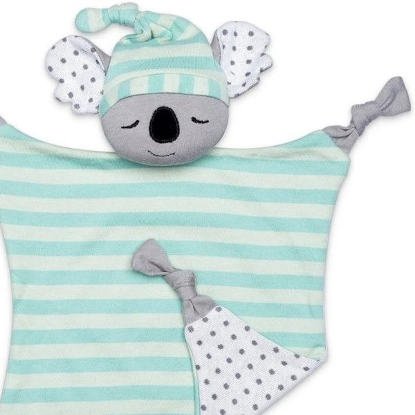Pour les bébés bio, et dès la naissance, Eveil Physique, Jeux & réconfort avec ce doudou plat à Nœuds, Doudou Plat à Nœuds Koala Kozy Rayé 30 cm Coton Bio Organic Farm Buddies™. Une doudou plat carré à nœuds de 30 cm de côté, en jersey de coton bio rayé Vert d’Eau et écru pour le corps et d’un gris souris pour les nœuds et le museau, habillé d’un joli pyjama rayé, pour faire de jolies siestes dans les arbres. Et bien sûr la sympathique bouille endormie de notre ami koala est là pour rassurer bébé,… Avec ses longues pattes à nœuds pour la saisir, ses grandes oreilles à secrets, notre Koala fera craquer plus d’un bébé. Avec ce doudou Organic Farm Buddies™ de la marque Californienne Farm Buddies™, Bébé pourra se dégourdir les doigts, mâchouiller, découvrir les couleurs, les formes, et les câlins. La tête de la peluche contient comme les hochets et le doudou plat carré assorti… un petit grelot discret.