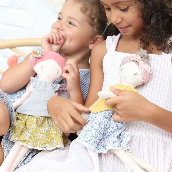 Pour les petits écolos, Eveil, douceur et réconfort en compagnie de cette adorable Grande Poupée de tissu fleurie Léonie 40 cm Coton Bio Albetta®. Rencontrez Leonie, qui fait partie de la nouvelle collection de poupées fées des fleurs d’Albetta ! Elle porte une magnifique tunique en mousseline bio bleue avec une jupe fleurie flottante, parfaite pour gambader dans les bois avec les fées ! Ses cheveux roses sont coiffés en deux chignons, accessoirisés d’une fleur faite à la main. Sa tenue est entièrement amovible…Cette poupée sera de toutes les aventures et toutes les confidences…