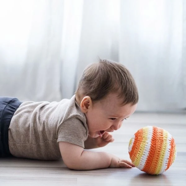 En plus de sa fonction ludique, notre balle hochet participe au bon développement de bébé. Dans un premier temps, elle stimule sa vision en l’entraînant à suivre du regard un objet. Plus tard, l’enfant exercera sa motricité . Tout d’abord, bébé se retournera puis rampera et enfin marchera pour la faire rouler. C’est un jouet évolutif. De cette manière il développe la préhension et la coordination œil-main. Son ouïe est également sollicitée. Le bébé peut l’attraper et le secouer, il entendra le son du grelot. En passant la balle d’une main à l’autre bébé fait travailler ses deux hémisphères cérébraux. Cette balle hochet en crochet est fait main de manière artisanale avec le plus grand soin. Cela la rend unique et spécial.