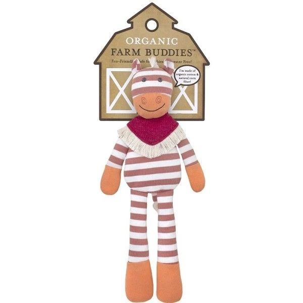 Pour les bébés bio, et dès la naissance, Eveil Physique, Jeux & réconfort avec cette Peluche Bio « Peluche Bio Organic Farm Buddies™ Poncho le Poney Coton Bio ». Une peluche doudou de 36 cm de hauteur, en jersey de coton bio rayé ocre et écru pour le corps et d’un orange mandarine pour les pattes et le museau, habillé d’un joli poncho à franges, pour cavaler dans le désert. Et bien sûr la sympathique bouille bien veillante de notre ami poney est là pour rassurer bébé,… Avec ses longues pattes pour la saisir, ses petites oreilles à secrets, notre poney fera craquer plus d’un bébé. Avec cette peluche doudou Organic Farm Buddies™, Bébé pourra se dégourdir les doigts, mâchouiller, découvrir les couleurs, les formes, et les câlins. La tête de la peluche contient comme les hochets et le doudou plat carré assorti… un petit grelot discret.