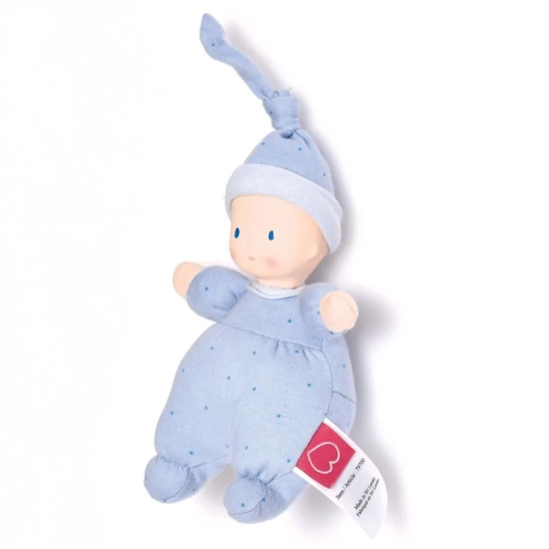 Pour les bébés bio et écolos dés les premiers mois, éveil confort et réconfort avec cette poupée de chiffons et caoutchouc couleur bleu clair, visage clair, surplombé d’une adorable petite tête douce en caoutchouc naturel aux traits peu marqué pour s’accommoder de l’état quotidien de bébé. Une adorable première petite Poupée de chiffon premier âge bleue à pois 22 cm tête caoutchouc naturel Bonikka. Une petite poupée premier âge tendre, saine et naturelle idéale pour accompagner bébé tout au long de la journée et pour adoucir ses moments difficiles. Fabriqué en coton et en caoutchouc Naturel issu d’une culture durable, ce jouet premier âge aux formes et textures douces permet à bébé de bien le saisir, de même que les différentes appendices offrent de quoi mâchouiller. Une poupée de coton et caoutchouc naturel, écologique, solide et durable qui saura résister aux jeux, aux léchages et mâchouillages et aux câlins nécessaires à la découverte du monde.